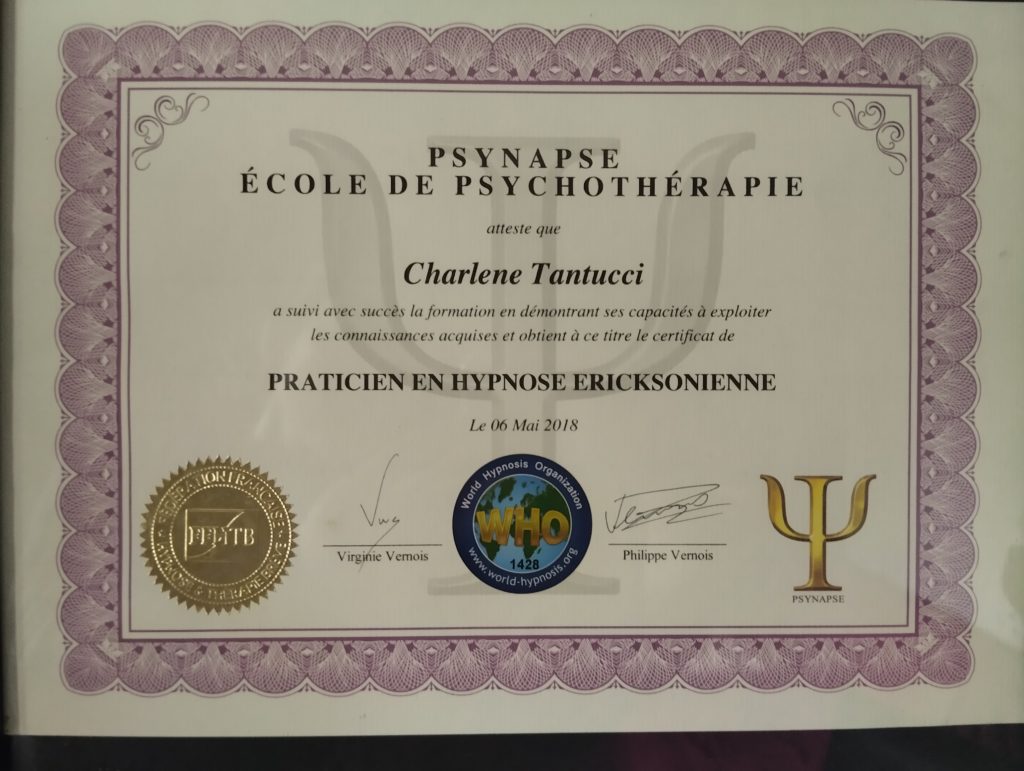 Certifiée de l’école de Psychothérapie PSYNAPSE, membre F.F.H.T.B (Fédération Française d’Hypnose et Thérapie Brève) et WHO (World Hypnosis Organization) depuis 2018.